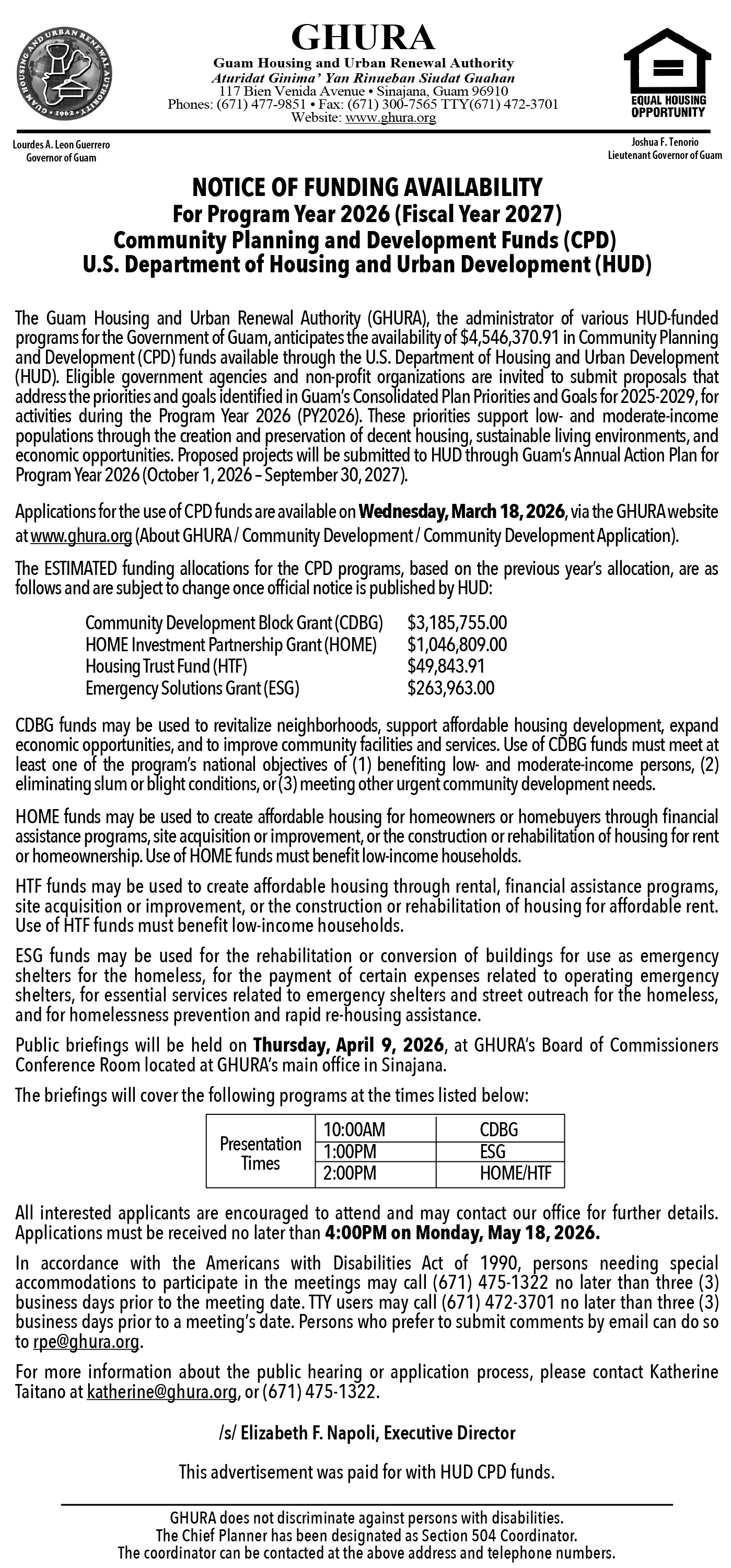 Notice of Funding Availability for Program Year 2026 (Fiscal Year 2027) Community Planning and Development (CPD)