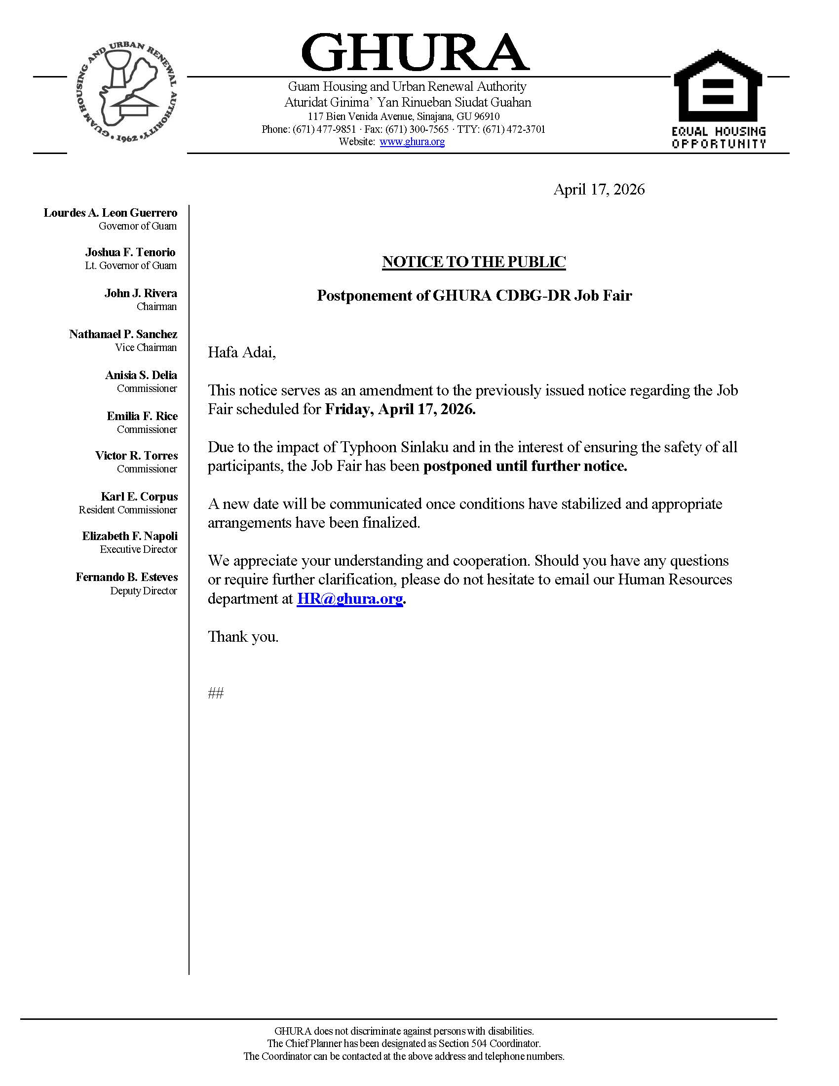Notice to the Public - Postponement of GHURA CDBG-DR Job Fair